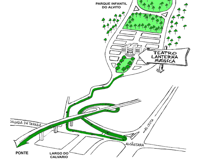 O Teatro Lanterna Mágica situa-se em Lisboa, no Bairro do Alvito (Freguesia de Alcântara), à entrada do Parque Natural de Monsanto, a cerca de 700 metros do Parque Infantil do Alvito, e a uns 400 metros do Clube de Ténis de Monsanto. Teatro Lanterna Mágica Telefones: (351) 21 361 68 20 / 96 702 43 74 |